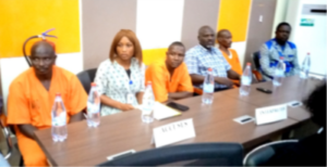 c’est un bout d’homme au visage d’enfant, lui c’est Azor Kalite, l’accusé principal (extrême droite sur la photo) dans l’affaire dite « Ndélé1 » Il a mis dans sa poche, en espace du temps consacré à sa prise de parole toute l’assistance lors de la reprise du procès. La journée d’hier était consacrée à la prise de la parole des accusés et c’est bien lui le premier sur la liste de passage à la barre. Le public est très attentif de la prestation on ne peut plus correct de celui-là qui se présente comme un ancien FACA et en même temps l’accusé principal. Le juge lui-même est surpris, tellement ce « polygame de 12 enfants » est parfaitement à l’aise dans la langue de Molière. Sa méthode est aussi remarquable: langage policé, cohérence dans ses déclarations, précision des dates, attitude irréprochable ; le traducteur à ses côtés se sent visiblement inutile. « Comment ce type aussi talentueux peut –il bien se retrouver dans cette histoire ? » s’interroge un élément de la police de la MINUSCA dans la galerie réservée au public avec un étonnement mal dissimulé.